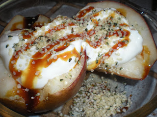 Place pear halves, up side up, in a oven-safe dish. In a separate bowl, mix together ginger juice, lemon juice, maple syrup, and salt. Pour over pears. Put into the oven to broil, on low, for 5-10 minutes. When pears are heated, remove from oven and top with yacon syrup and hemp seeds. In another bowl, combine yogurt, lemon juice, and liquid Stevia drops. Top pears with lemon yogurt. Enjoy!