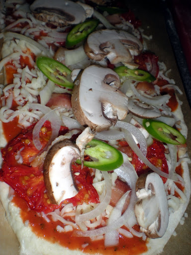 PIZZA 4: Tomato sauce, mozzarella cheese, dried tomatoes, mushrooms, white onion, fresh jalapenos, and topped with fresh tomatoes.