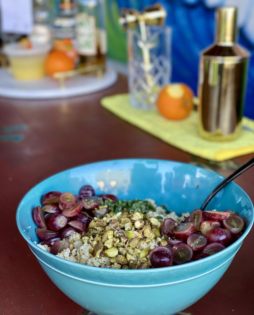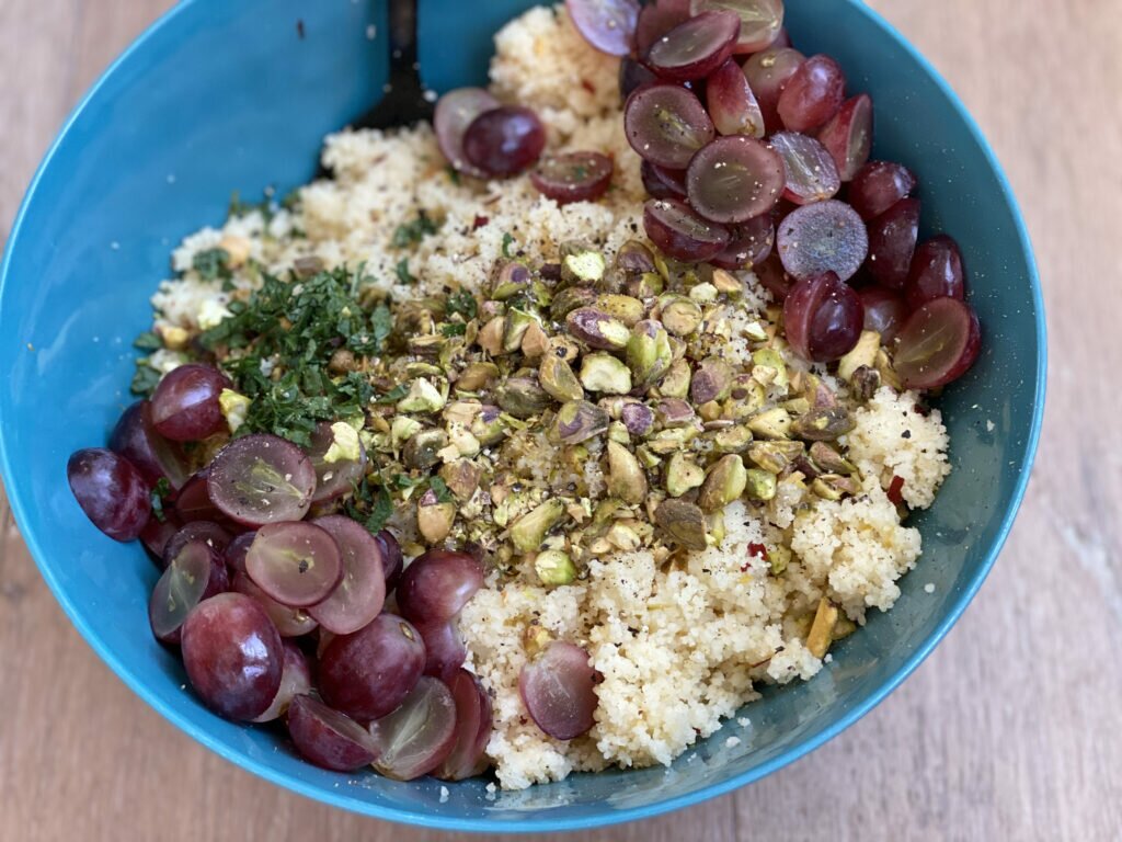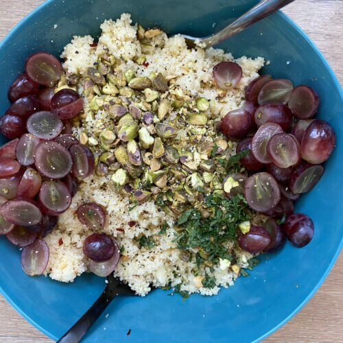 Add couscous to large bowl. Top with chopped pistachios (or nut of choice), grapes, and herb of choice.