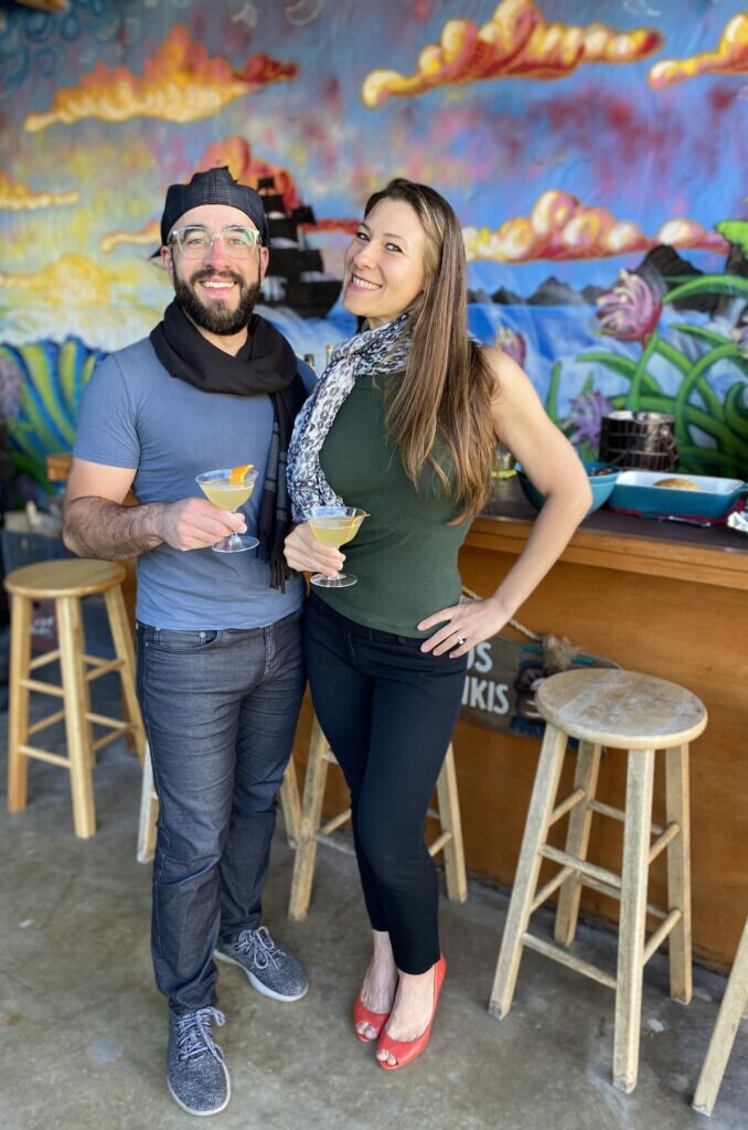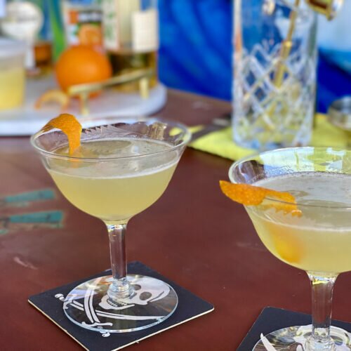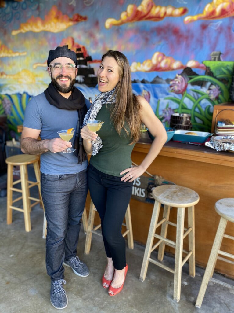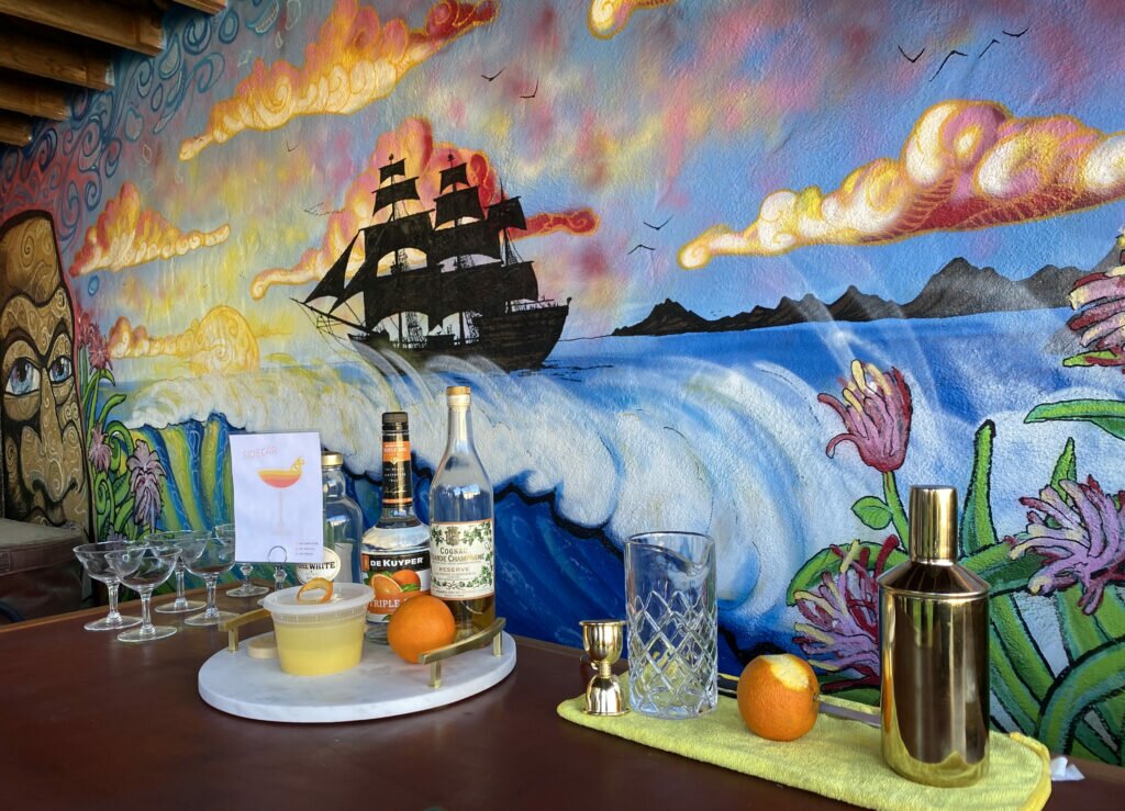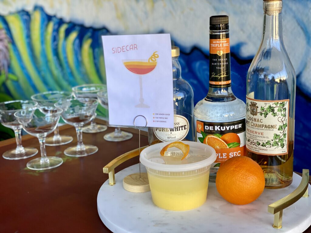 Playing off a French theme with Cognac, our Tiki-loving bartender (awesome neighbor friend, who happens to be obsessed with tiki-inspired things) decided the Sidecar cocktail was our drink of choice. And what’s better than drinking cocktails next door during a pandemic? Dressing up to drink like you have some place special to go during a pandemic! And that’s exactly what we did.