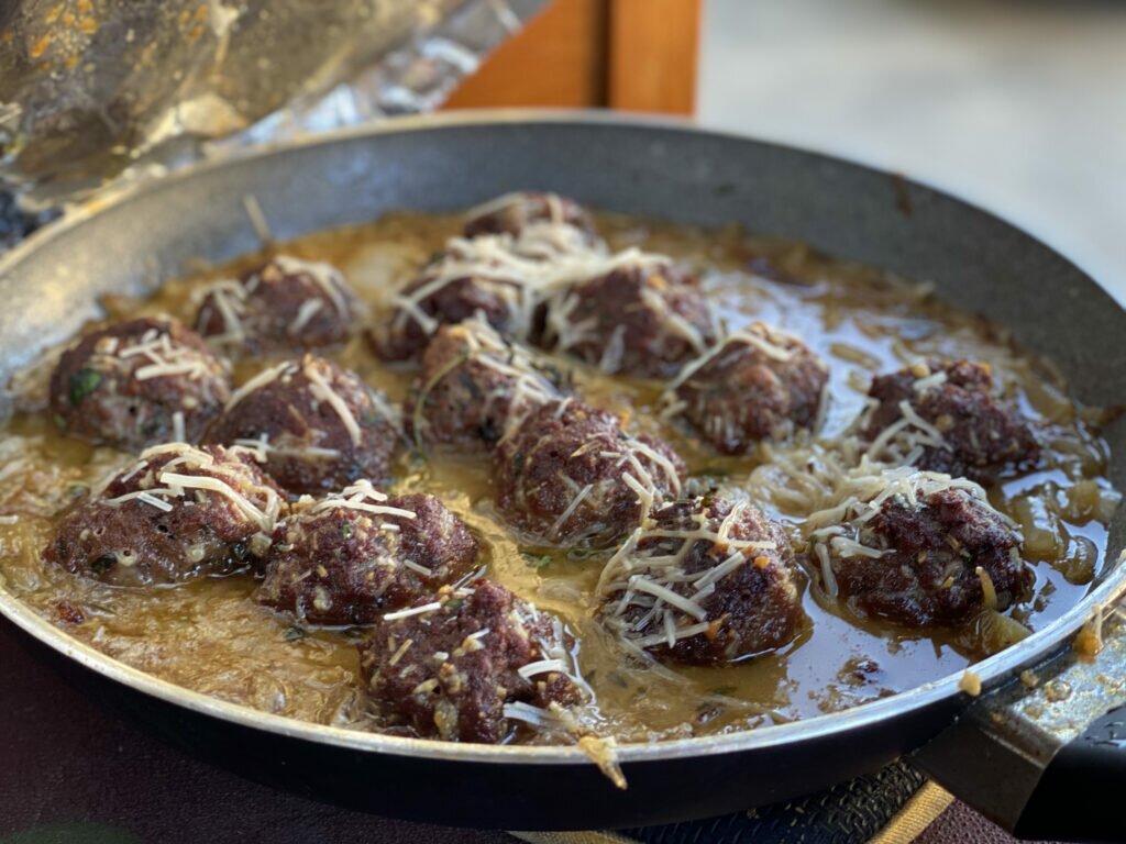 Add meatballs to skillet, cover with remaining cheese.